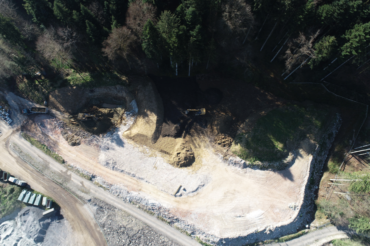 Da der Bauschutt im Wald abgeladen wurde, konnte vermieden werden, dass das Dorf Staubemissionen hatte. Wir gehen davon aus, dass wir den Wald gegen Ende nächsten Jahres fertig rekultiviert und angesetzt haben.