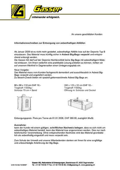 Die Gasser AG verspricht, dass sie die Deponie weiterhin nach bestem Wissen, Gewissen und mit grösster Sorgfalt betreiben wird. Für alle Anliegen rund um die Deponie Hächlerenfeld stehen Dominik Abt und Markus Gasser weiterhin gerne zur Verfügung. Allen Interessierten, Beteiligten und den Einwohnerinnen und Einwohnern der grossen Gemeinde Dagmersellen danken wir für das Verständnis und Wohlwollen mit Blick auf eine umweltgerechte Entsorgung. Wir wünschen Ihnen und Ihren Angehörigen frohe Festtage und einen guten Rutsch ins Neue Jahr.